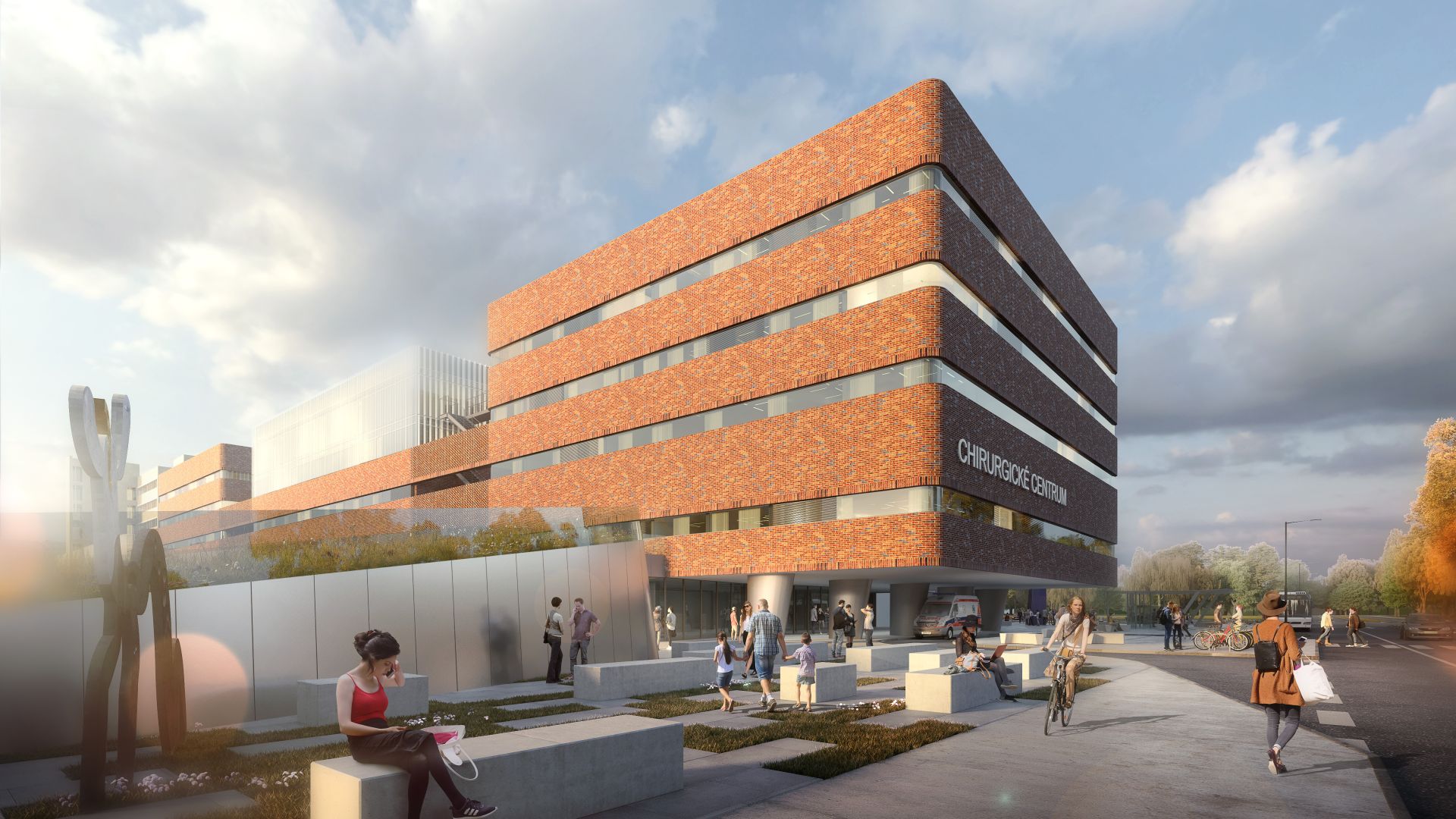 Zvolené tradiční materiály posílí vážnost budovy a zároveň vzbudí dojem útulnosti a známého prostředí. Jasná hmotová koncepce podpoří pěší osu procházející internou a mezi objekty interny, chirurgie a onkologie vznikne prostor, který bude rozšířen o relaxační zónu. Základní provozní cesty pacientů i personálu, které jsou již po výstavbě Interny a Emergency dlouhodobě užívané, budou zachovány a navíc podpořeny.